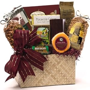 Enjoy savory Italian seasoned Foccacia Crisp Crackers, aged Cheddar Cheese, Italian Salami, Smoked Almonds, Honey Mustard Pretzels, Butter Toffee Pretzels, Dolcetto Tiramisu Filled Cookies, Perugina Italian Cappucino Bar, Walkers Chocolate English Toffee, and Premium Coffee.